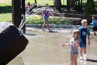 The kids, Auntie Teresa and I headed to Portland to spend the afternoon at the Grundland Picnic. We enjoyed lots of food, a dose of sunshine, splahing in the fountains, playing at the playground, and catching up the the extended family. Grandma Martin braved the return trip with us and we made it as far as Government Camp before we had to take a break from the care and the crying baby. We hiked a little up the mountain trail and took some deep breaths of the mountain air. I gave Ruby a snack and tucked her into her carseat snuggly with Grandma Martin tapping on her binky and we continued our journey. Elijah and Corinne had a cliff bar in the car for dinner. We made it home safely by 9:30 pm and Ruby had finally went to sleep for the last hour.